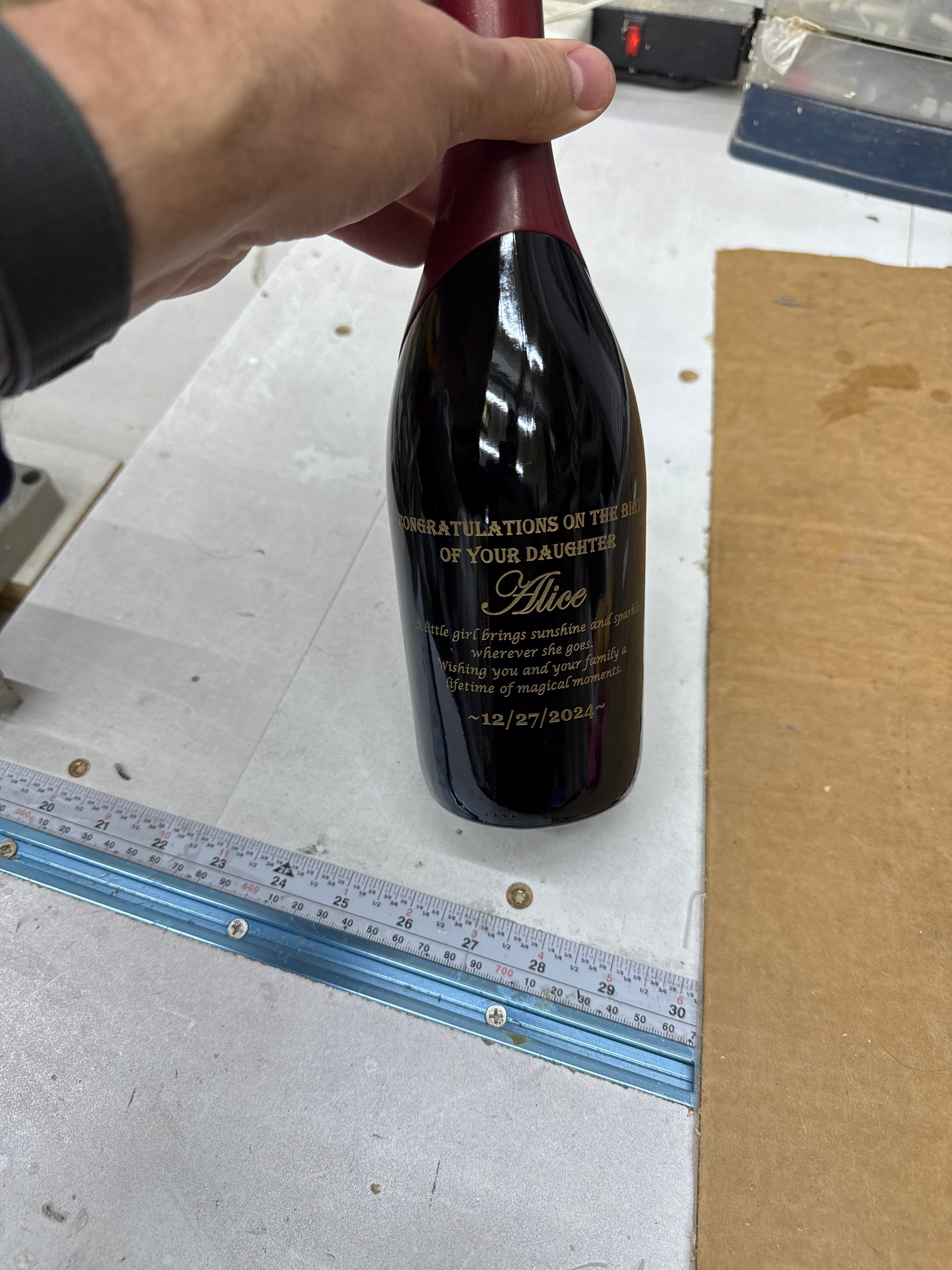 Create a meaningful gift or standout item with our custom bottle laser engraving services. Perfect for wine, whiskey, and other liquor bottles, we personalize each bottle with:
