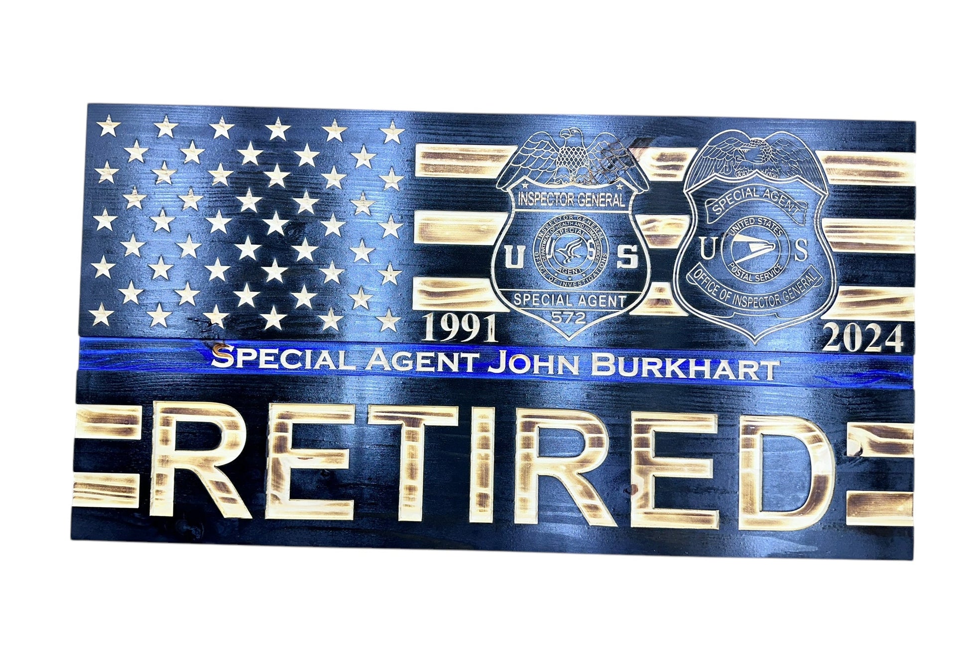 Show your support and respect for law enforcement with this beautifully handcrafted Thin Blue Line flag. Expertly crafted from high-quality wood, this flag features custom engraved badges, patches, or logos with exceptional attention to detail, ensuring the highest level of accuracy. Personalized text, such as names, ranks, or years of service, can also be added to create a meaningful and unique tribute.